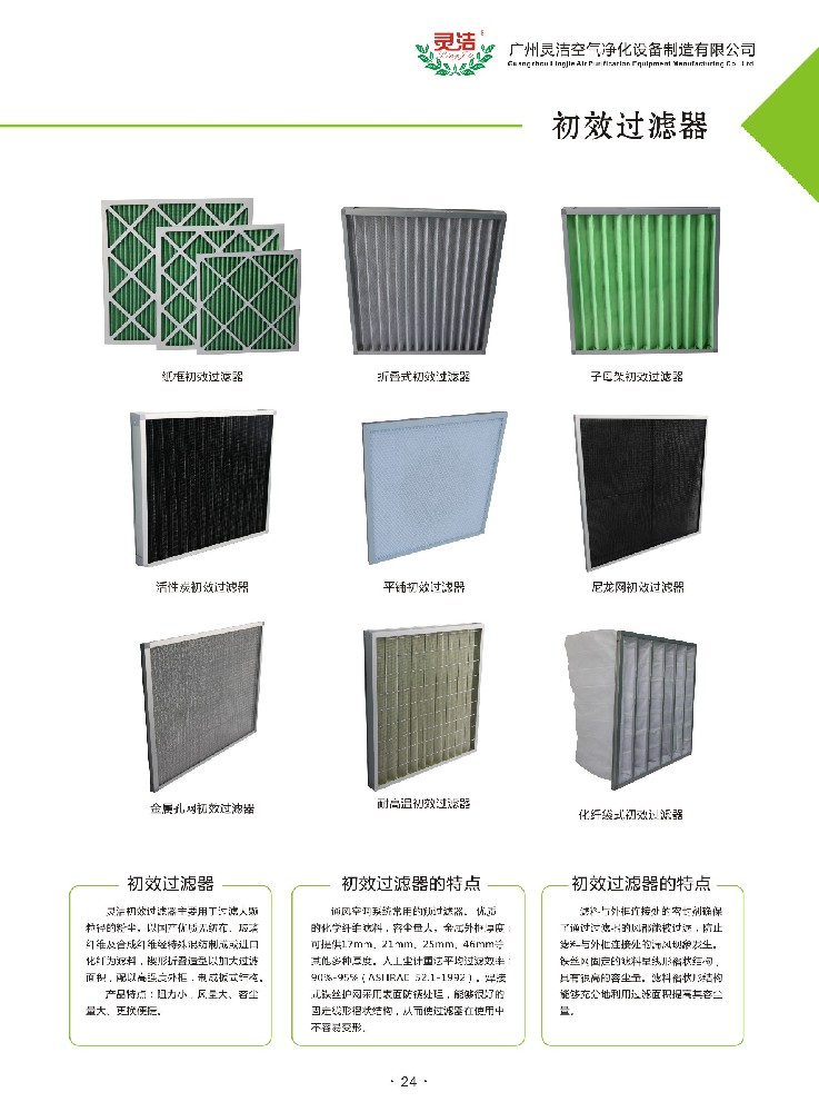 初效空氣過濾器有板式、折疊式、袋式、箱式四種樣式,外框材料有紙質(zhì)框、鋁合金框、鍍鋅鐵框,不銹鋼框,過濾材料有無紡布、尼龍網(wǎng)、活性炭過濾棉、金屬孔網(wǎng)等,防護(hù)網(wǎng)有雙面噴塑鐵絲網(wǎng)和雙面鍍鋅鐵絲網(wǎng)。價(jià)廉、重量輕、通用性好、結(jié)構(gòu)緊湊。